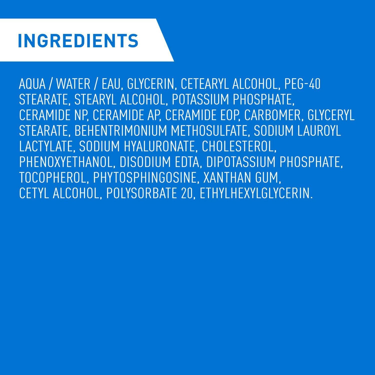 Aqua / Water / Eau, Glycerin, Cetearyl Alcohol, Peg-40 Stearate, Stearyl Alcohol, Potassium Phosphate, Ceramide NP, Ceramide AP, Ceramide EOP, Carbomer, Glyceryl Stearate, Behentrimonium Methosulfate, Sodium Lauroyl Lactylate, Sodium Hyaluronate, Cholesterol, Phenoxyethanol, Disodium EDTA, Dipotassium Phosphate, Tocopherol, Phytosphingosine, Xanthan Gum, Cetyl Alcohol, Polysorbate 20, Ethylhexylglycerin